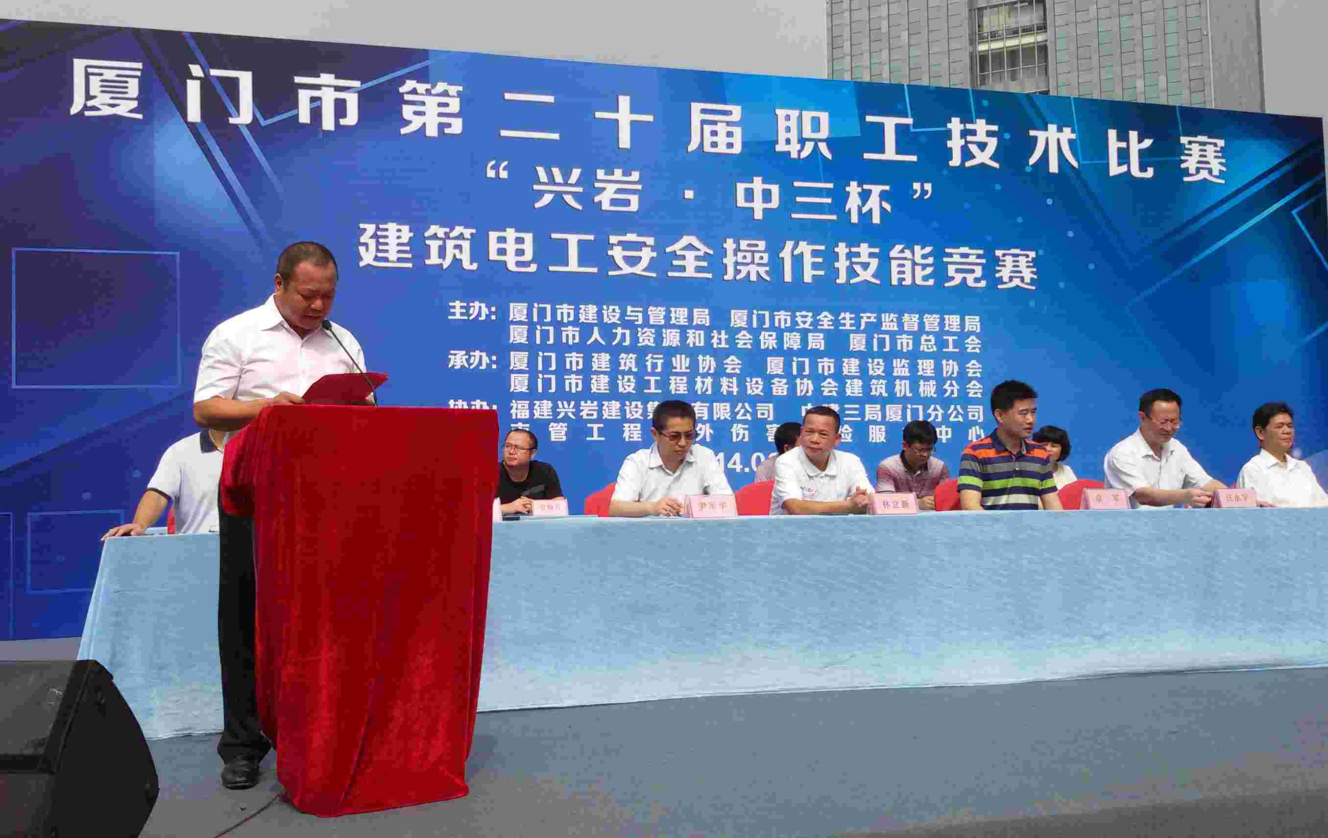 為深入宣傳“強化紅線意識,促進安全發(fā)展”的安全生產(chǎn)月活動主題。由廈門市建設(shè)與管理局、廈門市安全生產(chǎn)監(jiān)督管理局、廈門市人力資源和社會保障局、廈門市總工會共同主辦的,廈門市第二十屆職工技術(shù)比賽——“興巖·中三杯”建筑電工安全技術(shù)操作技能競賽,于6月18日上午在集美區(qū)杏林灣營運中心12號樓施工競賽現(xiàn)場舉行。開幕式由廈門市建設(shè)與管理局張清輝處長主持,我集團董事長葉小清致辭,參賽選手及裁判代表分別宣誓。隨著廈門市安全生產(chǎn)監(jiān)督管理局領(lǐng)導發(fā)布開賽令,競賽正式拉開序幕。