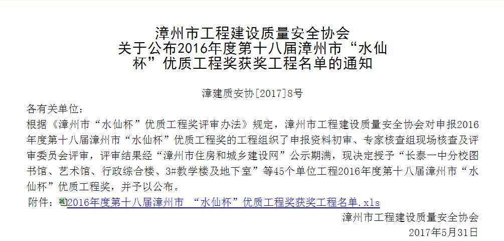 日前,漳州市工程建設(shè)質(zhì)量安全協(xié)會(huì)根據(jù)《漳州市“水仙杯”優(yōu)質(zhì)工程獎(jiǎng)評(píng)審辦法》規(guī)定,對(duì)申報(bào)2016年度第十八屆漳州市“水仙杯”優(yōu)質(zhì)工程獎(jiǎng)的工程組織了申報(bào)資料初審、專家核查組現(xiàn)場(chǎng)核查及評(píng)審委員會(huì)評(píng)審并經(jīng)公示期滿,由我集團(tuán)承建的“長(zhǎng)泰一中分校圖書館、藝術(shù)館、行政綜合樓、3#教學(xué)樓及地下室”工程項(xiàng)目榮獲2016年度第十八屆漳州市“水仙杯”優(yōu)質(zhì)工程獎(jiǎng)。
