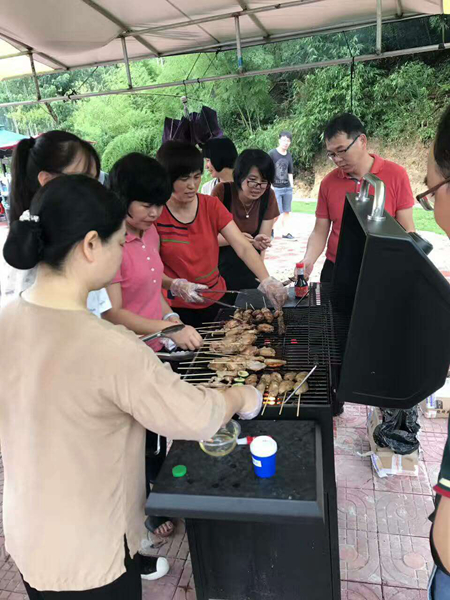 傍晚時分,我們來到燒烤區(qū),大家分工合作,洗菜的,燒火的,竹簽插蔬菜的,大家忙得不亦樂乎,不大一會兒,燒烤場中炊煙裊裊,還沒等火生好,大伙兒已經(jīng)迫不及待地圍坐在爐邊,把早已串好的食物放到爐上,霎間整個燒烤場飄逸著肉的香味。大家吃著自己親手烤出的各種食品,聊著自己在工作和生活中遇到的各種趣事,其樂融融!孩子們追逐嬉鬧的歡快身影和甜美的童音感染了大家,歡聲笑語縈繞在南山谷的上空……