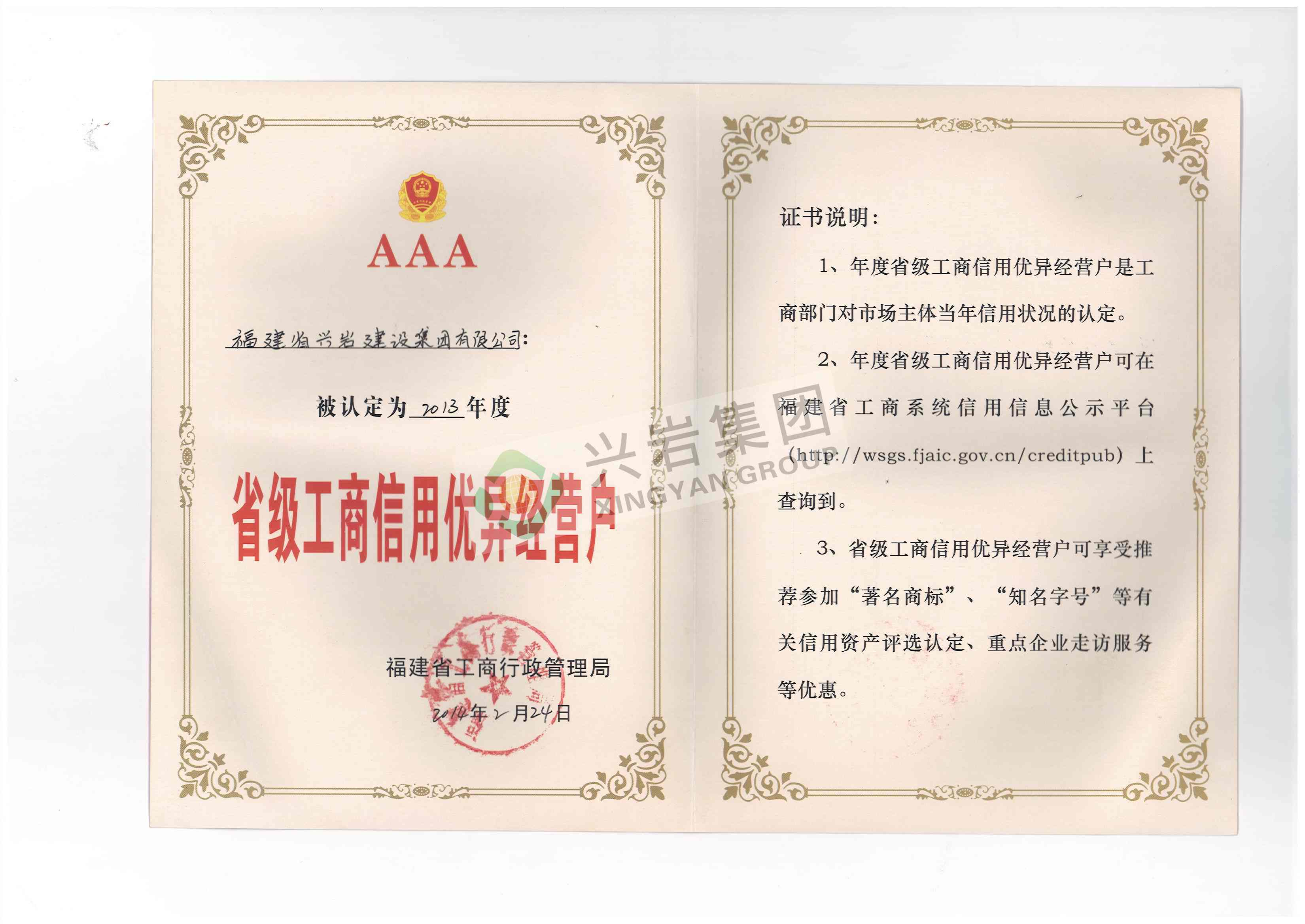 省級工商信用優(yōu)異經(jīng)營戶AAA
