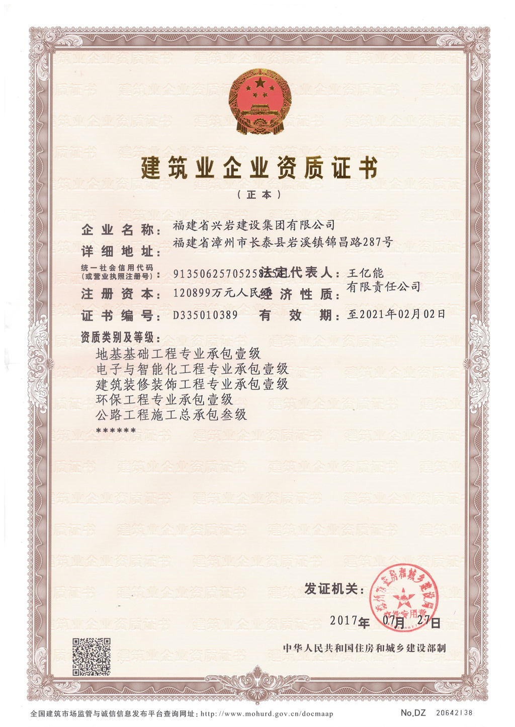 地基與基礎(chǔ)、建筑裝飾、環(huán)保工程、建筑智能化一級、公路總承包三級