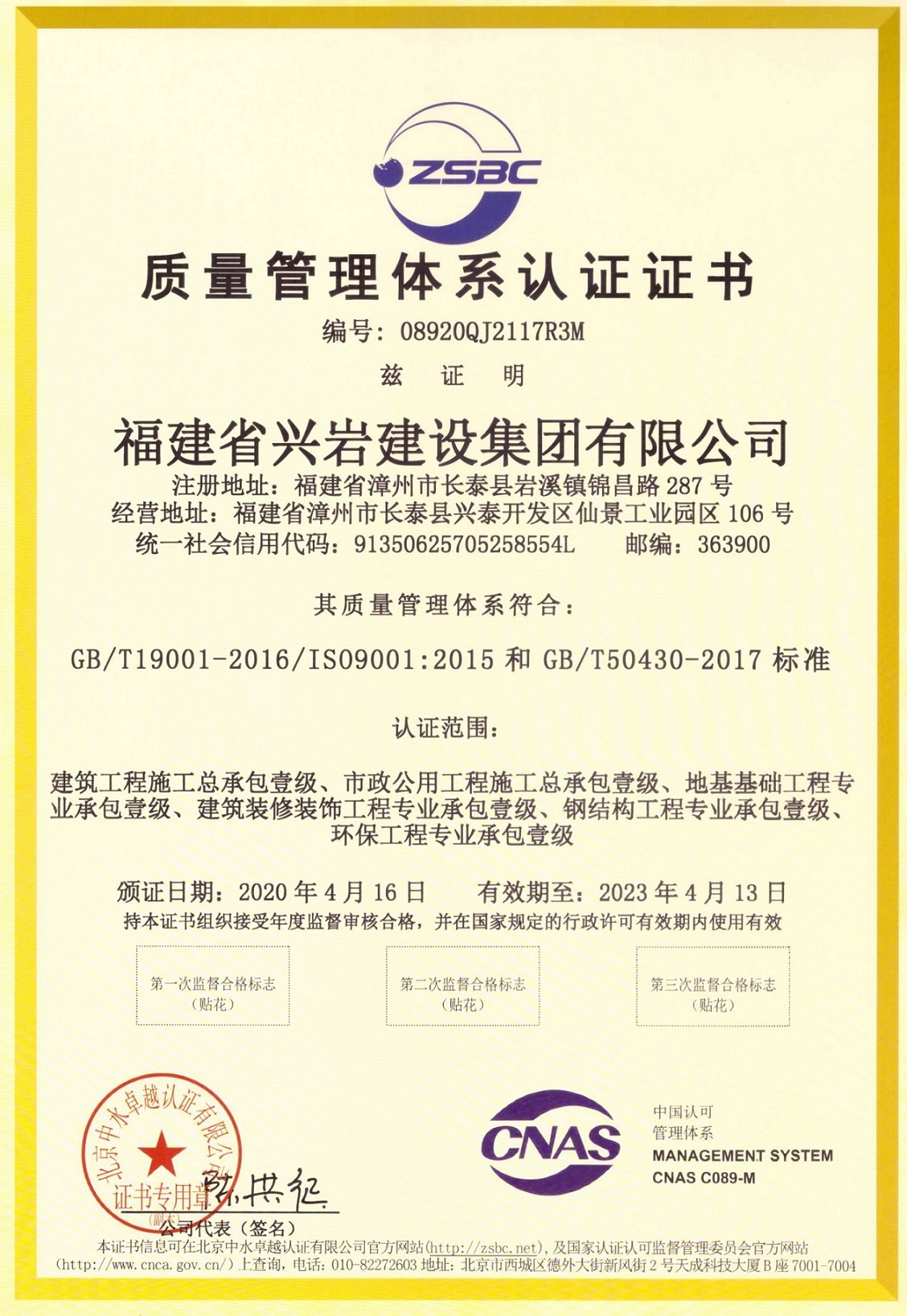 質(zhì)量管理體系認證證書